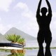 3. Exhaling, lift your heels briskly off the floor and roll your hands forward above your head (3a) in a circular motion; slowly lower hands to the chest level (3b) while bending your knees gently; and end in posture 4, completing exhalation.