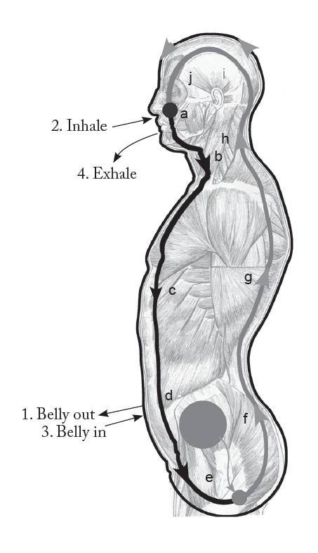 Belly Breathing Diagram: during in-breath your belly swells and the energy flows down along the frontal center of your torso, and during out-breath your belly contracts and the energy flows upward along the spinal cord in the back.