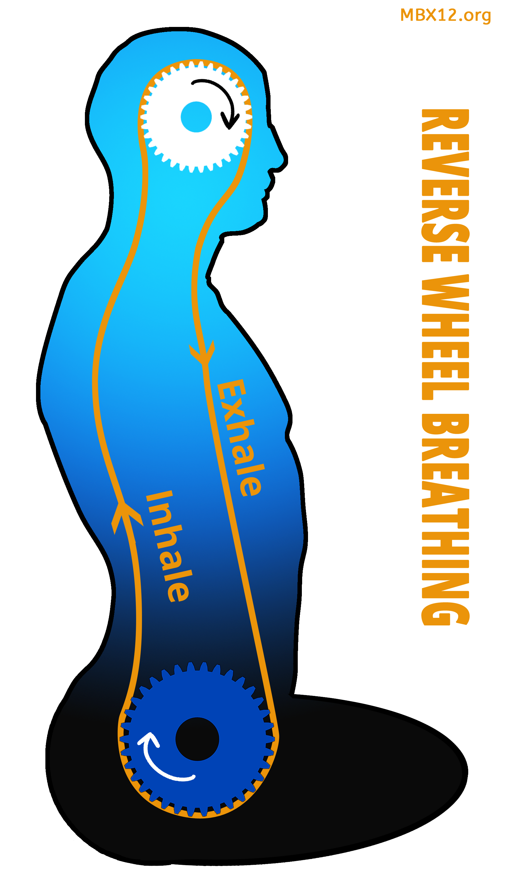 With any MBX-12 movement, you can practice Reverse Wheel Breathing Method: During in-breath your consciousness rises from the sacrum, arriving in the middle of the eyes; during out-breath let go of your consciousness downward to the lower energy center.